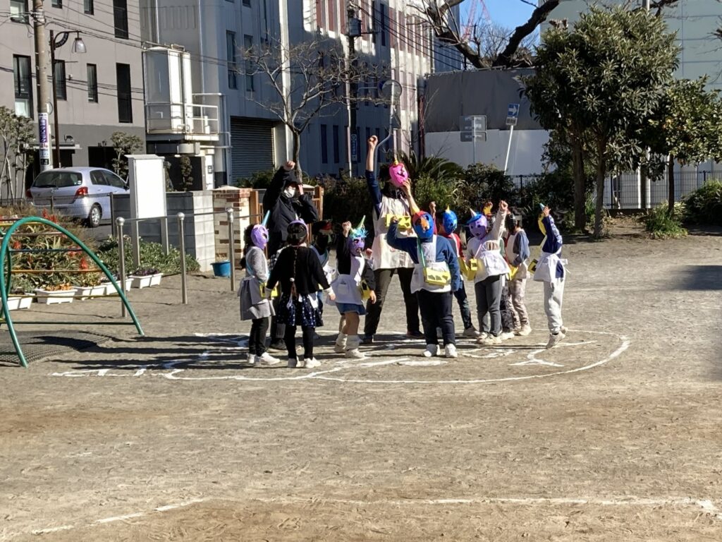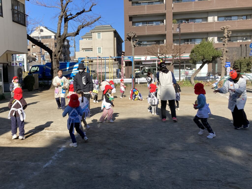 それぞれの部屋で豆まきを終えてから園庭へ、自分達で作った鬼のお面に豆入れを持っていざ出陣!!